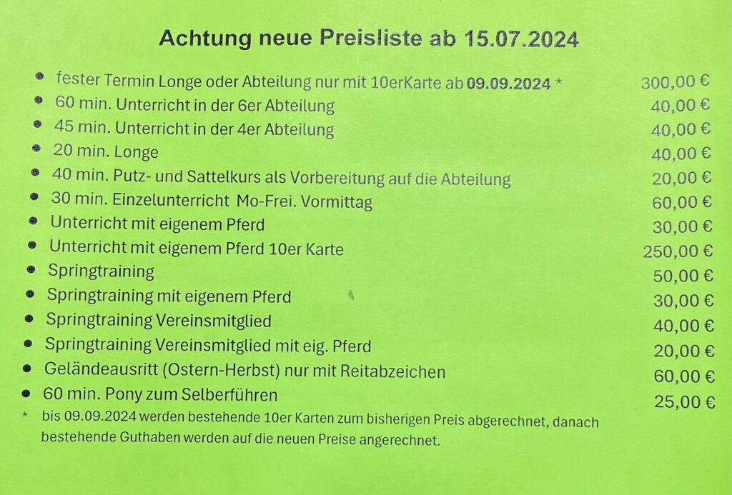 Leider müssen wir den Betrieb für den normalen Reitunterricht vorerst schließen. Alle Kunden mit Verträgen bitten wir, individuelle Termine zu vereinbaren. Alle bestehenden Termine sind erst einmal hinfällig.